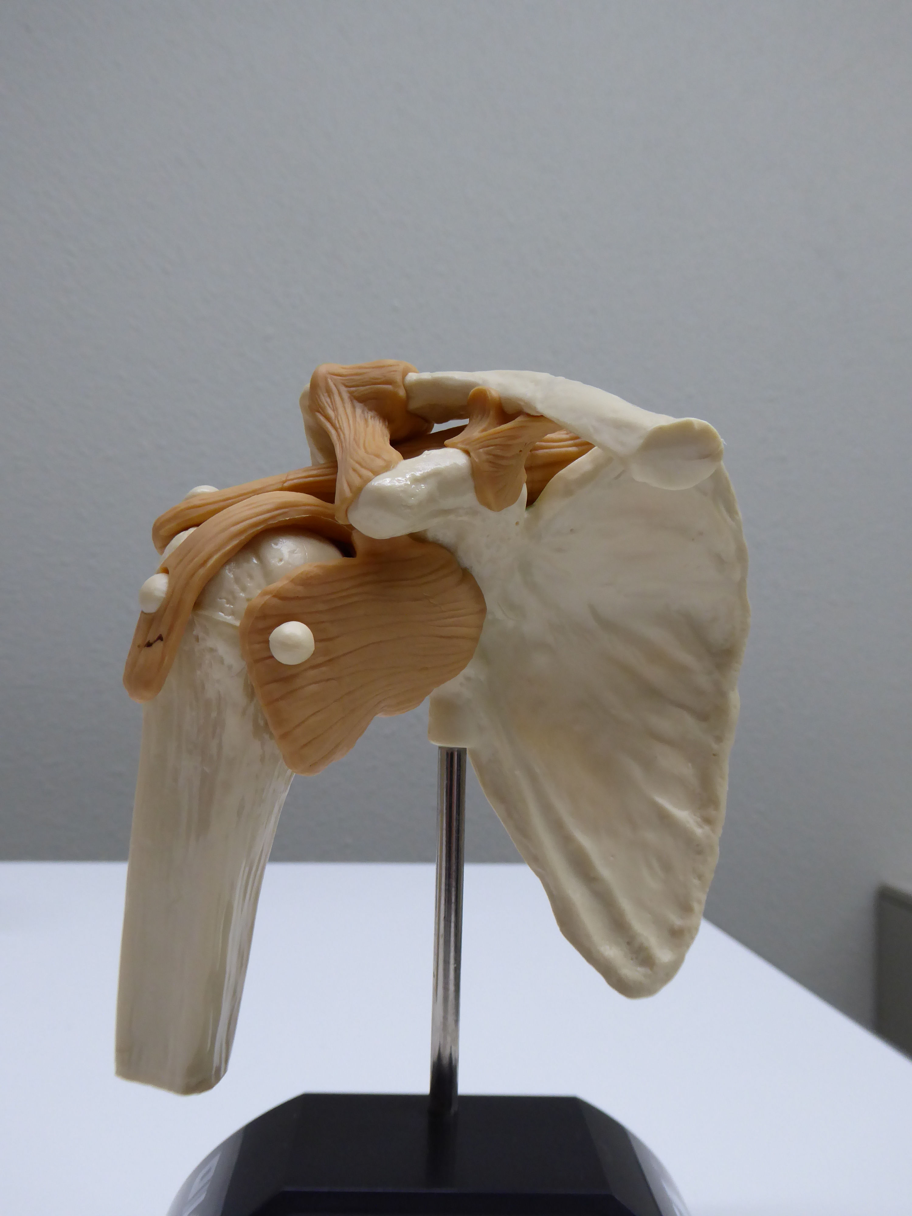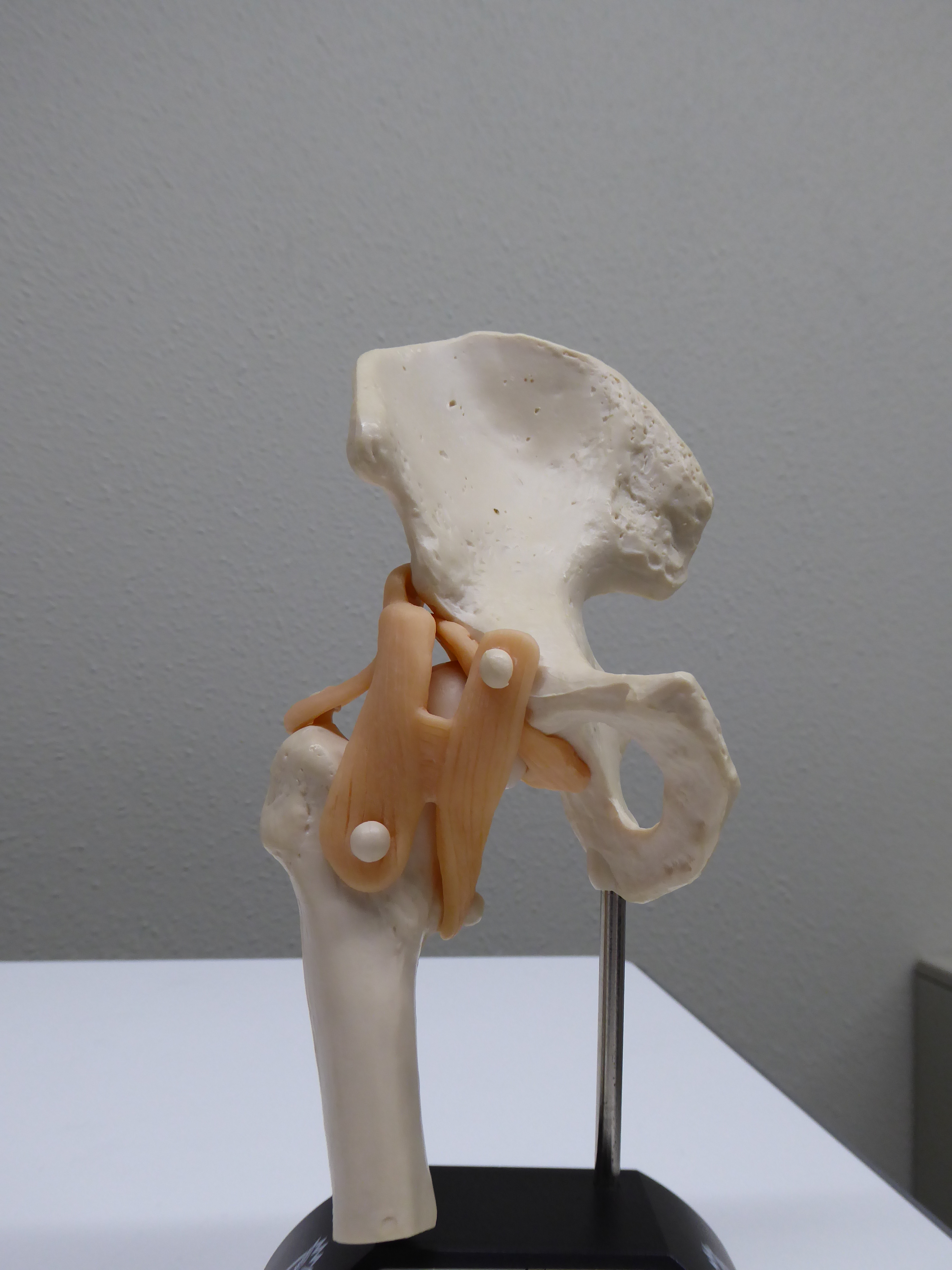 授業内容は人体の構造と機能について学ぶというものです。初歩的な解剖学的そして生理学的な内容となります。これまではほとんど関心がなかったと思われる骨や筋肉、内臓、神経などのしくみや働きについて講義しますが、今挙げたものすべてが皆さんのからだに存在するものです。それらが一生懸命働いてくれることで私たちは元気に暮らすことができるのですから、からだに対する感謝の気持ちを持って学んでもらえれば、と思いながら授業をしています。写真は関節(左;肩関節、右;股関節)の標本模型です。