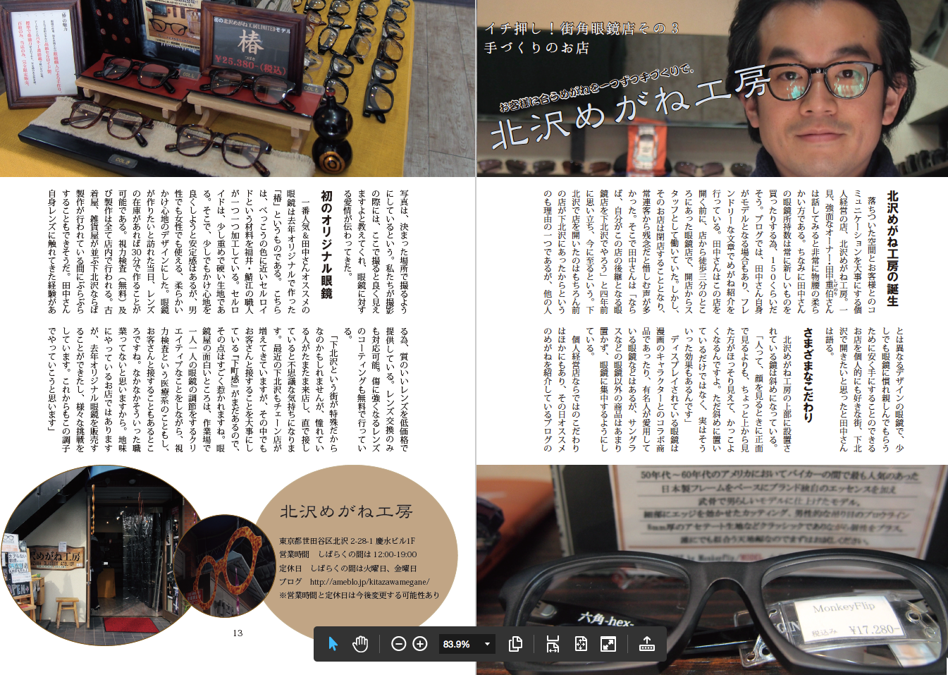 サブタイトルの通りメンバー全員が眼鏡。ということで眼鏡雑誌とちょっと単純過ぎるテーマ設定だったが、それぞれの企画はなかなか凝っている。とくに「メガネ旅」や「Megane Animals(メガネ・アニマルズ)」といった企画の発想がおもしろかった。記事の作り込み部分が甘いのが残念。雑誌として全体的にいい方向に向いっているので、ページ構成の面でもっとしっかり作り込めると、もっと素敵な雑誌になったと思う。