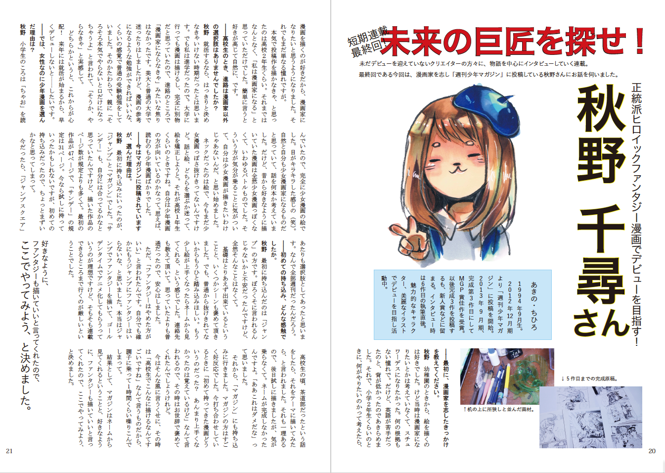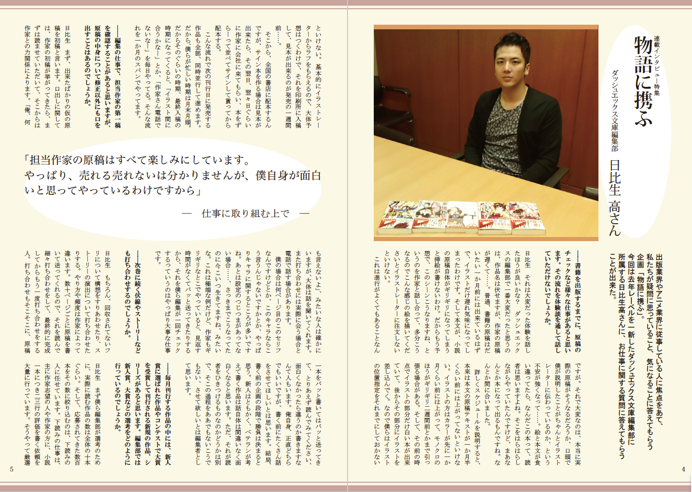 「物語と作るクリエーターのための雑誌」というテーマで進んでいたが、なかなかまとまらなかった。メンバーの方向性、ペースの違いもあって、最後のまとめに非常に苦労していた。ライトノベル編集者、ファンタジー漫画家へのインタビューはかなり読ませる力作。しかし、他の企画が弱くその面で出来不出来のページの落差が大きい。この雑誌制作はグループ制作なので、仕方ない面もあるが、いかにグループで雑誌をまとめていくかも重要だ。