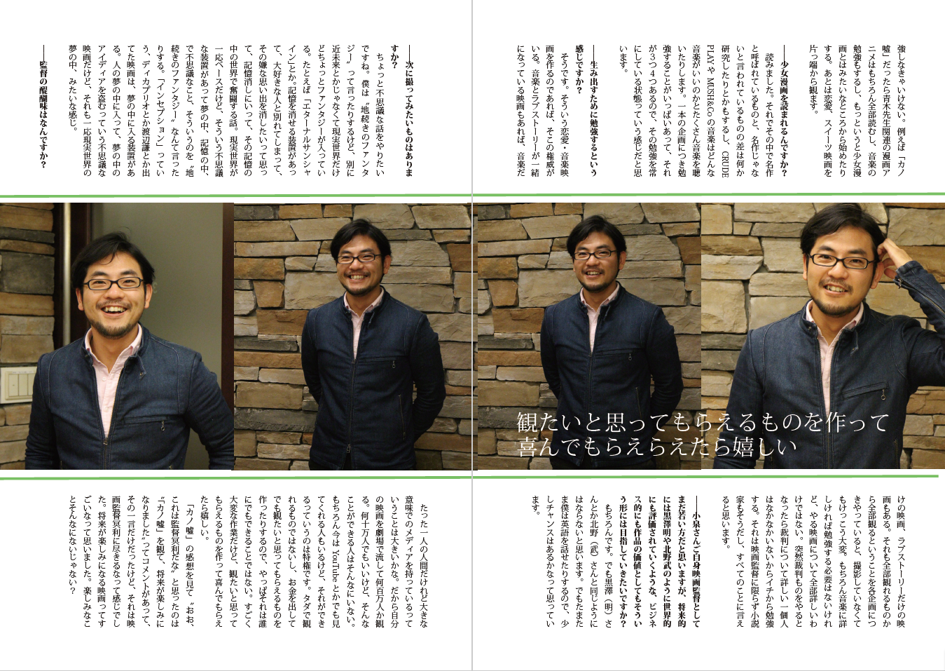 映画をテーマにした雑誌。とくに製作者側に視点を置き、読者もクリエーター、クリエイター指向の人に向けた雑誌を狙っている。ワークショップⅣで取材した小泉徳宏監督へのインタビューは、それなりにしっかりしているが、他の部分の取材の薄さが気になる。表紙など、かっこよくまとめているのだが、その中味との連動が薄い。雑誌は見栄えだけでは成り立たない。企画とビジュアルが一体となって、読者に伝わる雑誌になることをさらに追求して欲しい。