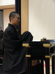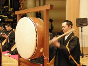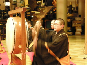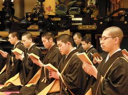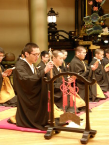 今回お唱えしたお経は、総本山智積院で毎朝護摩のご祈祷の際にお唱えしているものです。水曜礼拝に合わせて少し調整をし、太鼓も取り入れ総勢22名でお唱えしました。法儀実習の授業や夏の本山研修で着々と力をつけ、自信もついた学生たちが気持をこめてお唱えしたお経は礼拝堂に響き渡っていました。