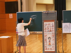 今回の写仏は、真言宗智山派が担当し、講師に鈴木裕子先生をお招きしました。最初に写仏の基本的な説明がありました。写仏は書道とちがって、二度書きや紙の向きを変えて行っても構わないこと。肝心なのは心をこめて丁寧に仏さまを写すことが大事であると強調していました。