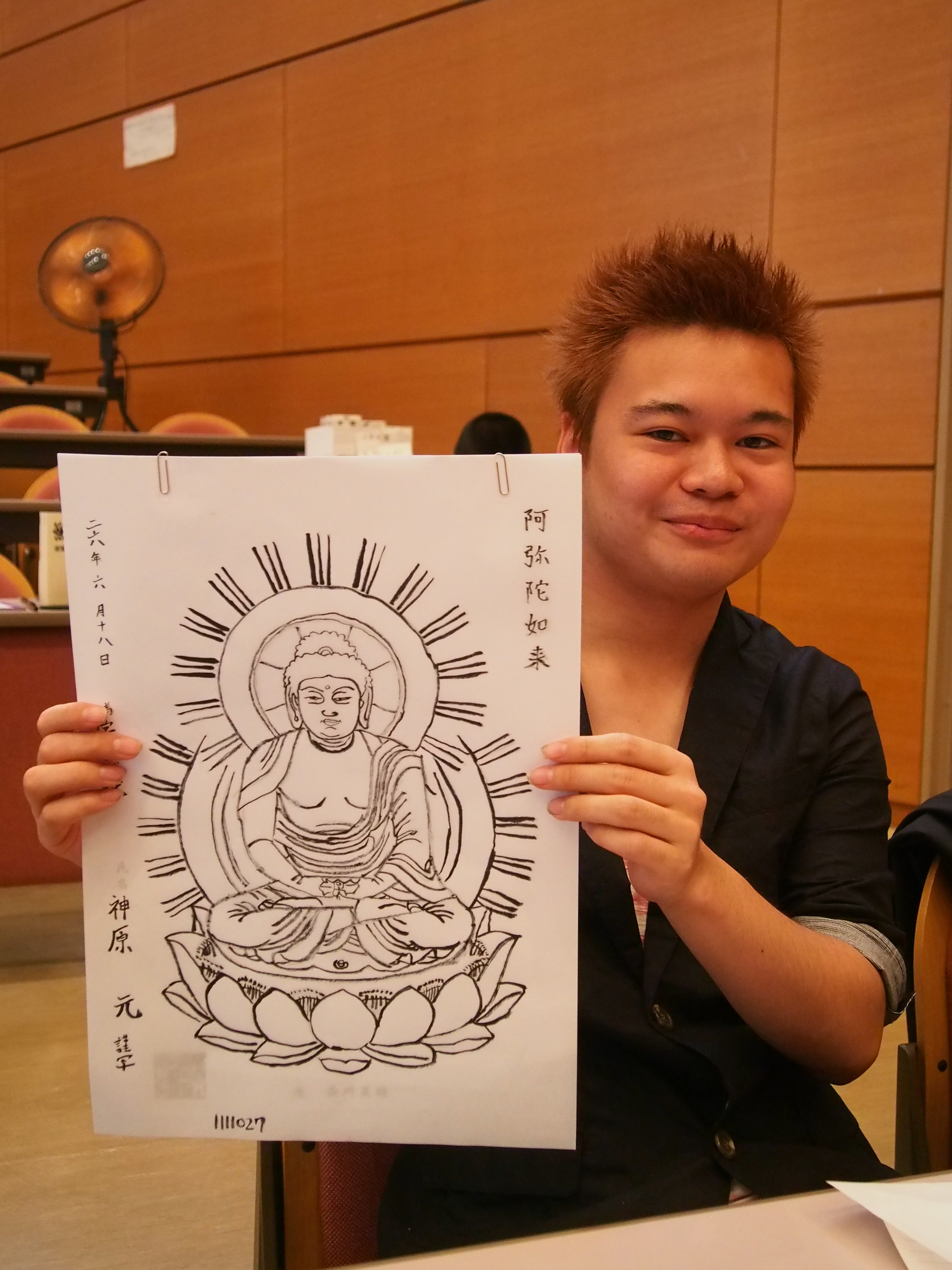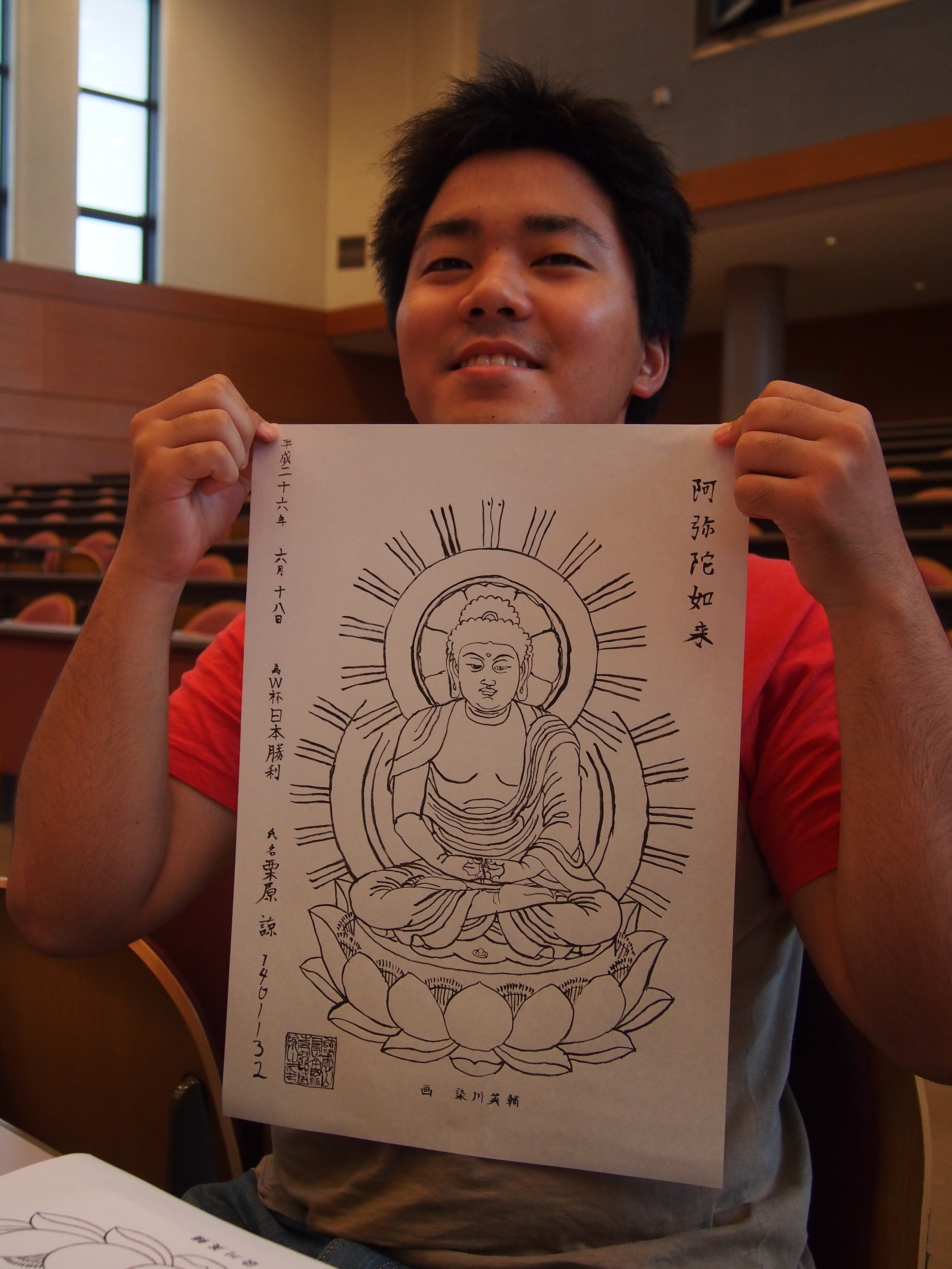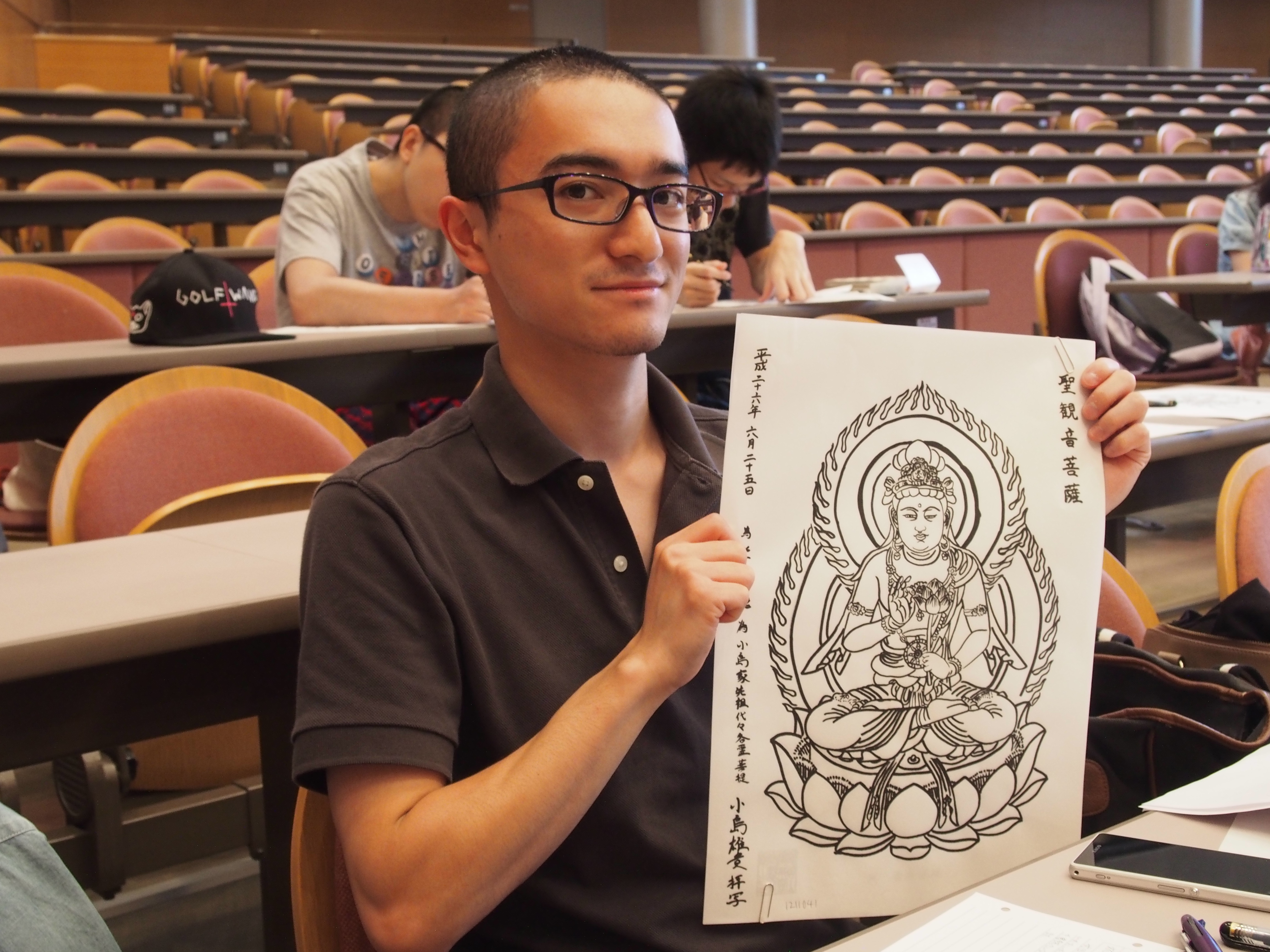 写仏をおえた学生に許可をとり、写真を撮りましたが、恥ずかしそうにとる人や、自信満々な表情で撮る人など、さまざまでした。「学業成就」、「家内安全」、「世界平和」など各々願い事を書いていました。