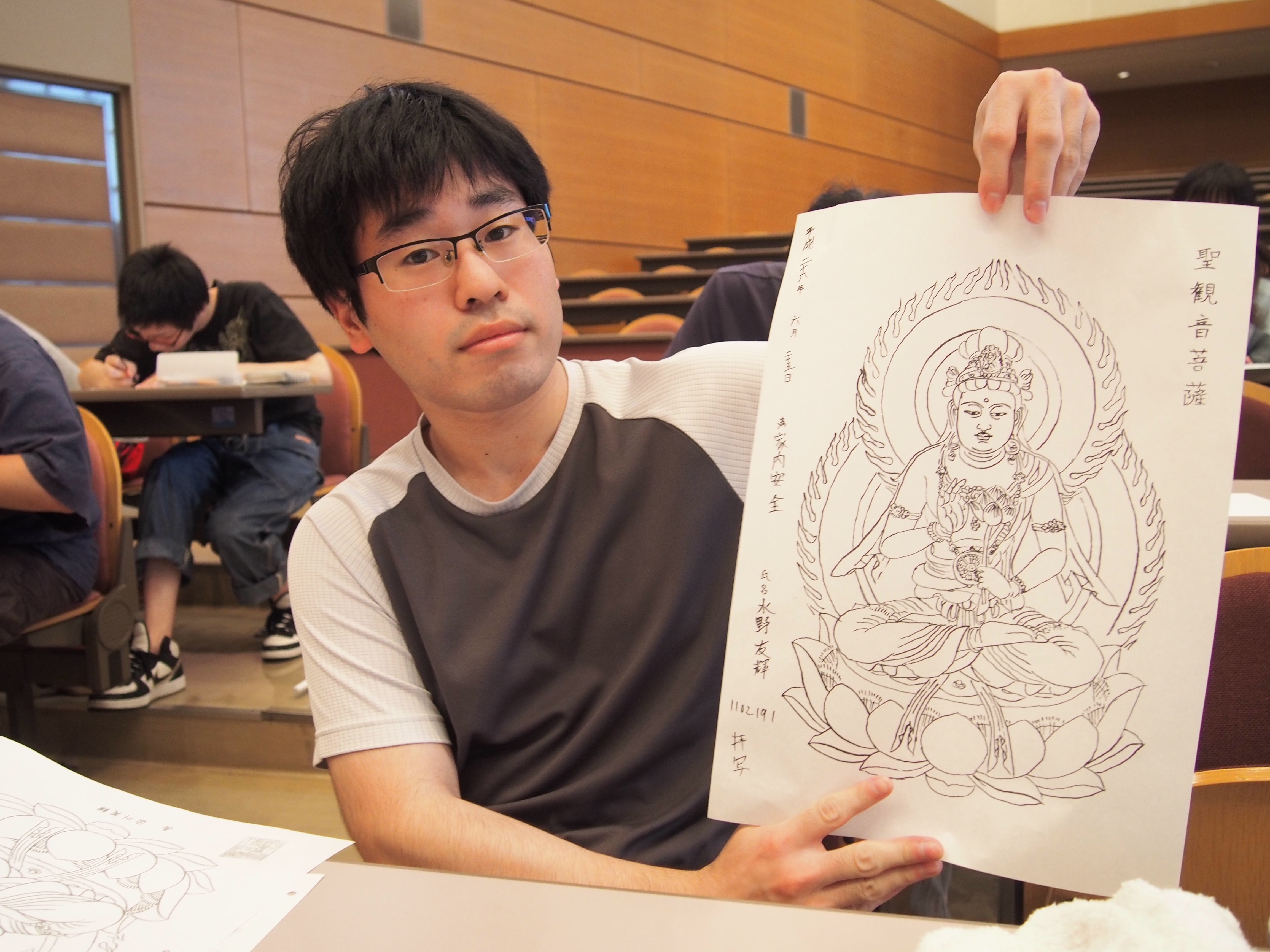 初めて体験する学生が多く、おそるおそる筆を運ぶ姿が見られました。一週目の阿弥陀如来より2週目の聖観音菩薩の方が線が細かく、皆時間かけて、丁寧に写していました。学生は同じ仏さまを写しているわけですが、力の入れようによって、線の太さや強弱が人それぞれとなり、仏さまを写すことの難しさを感じていたようです。