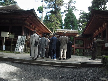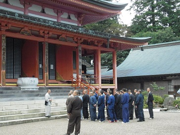 さらに、この研修では、回峰行を体験します。回峰行は比叡山の峰々をめぐり、山中のさまざまなお堂を巡拝する修行です。この研修でも実際の回峰行と同様に夜の2時に起床して、西塔から横川へ、横川から比叡山を下って、ふもとの坂本まで下ります。およそ4時間の行程ですが、電灯など無い山道を懐中電灯だけを頼りに、駆け下ります。ふもとの滋賀院で頂戴する久しぶりの「パンとジュース」の朝食が何よりのごちそうです。小一時間ほど休憩をはさんで、今度は無動寺坂と呼ばれる坂道を約1時間で駆け上がります。この登り坂が最大の難関です。
