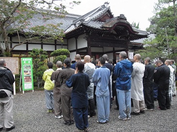 この講座では、普段の学生生活とは異なって、比叡山山中で一週間過ごします。その間の生活も、本来の修行に近い生活で、5時半に起床し、朝のお勤め・座禅にはじまり、日中は法要の実習をしていくという生活です。学生の間にも、普段とは違って緊張感がみなぎっています。