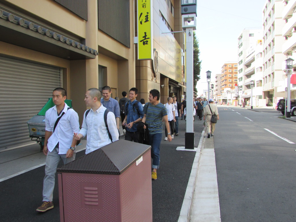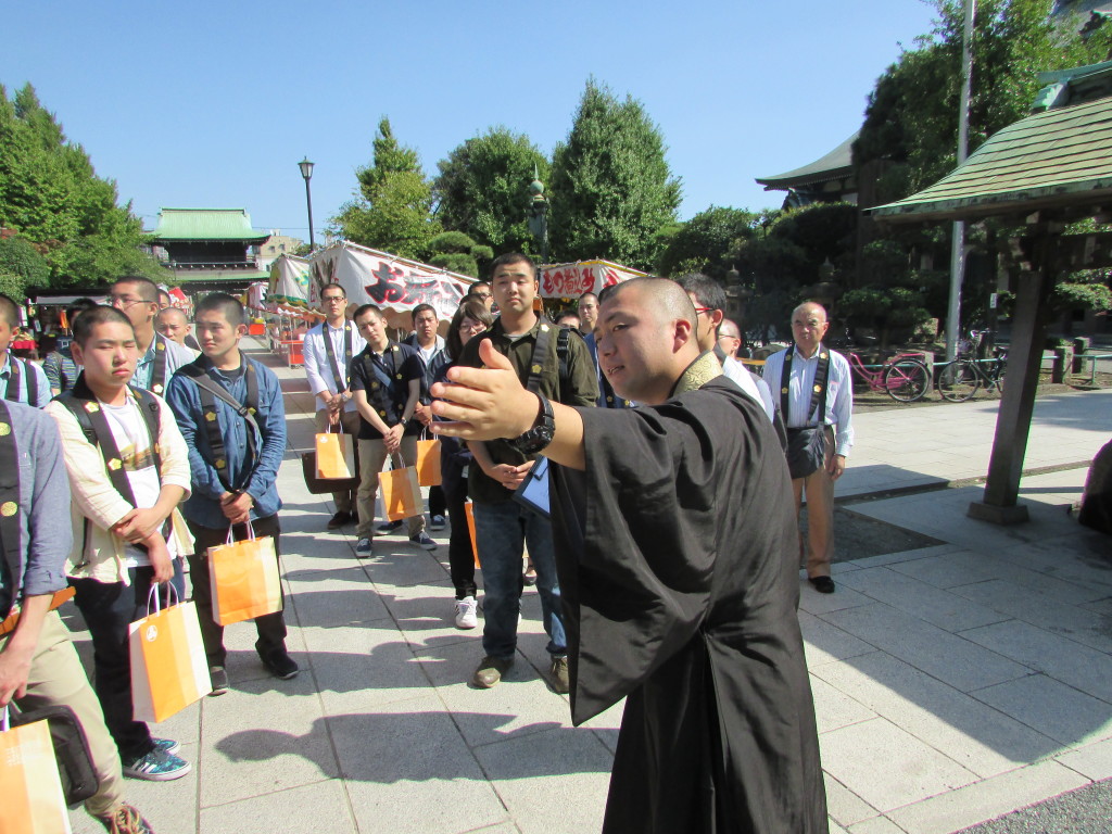 また、この参詣は一年から四年の学生全員が参加する企画であることから、普段あまり関わることのない先輩と後輩の関係を密にしてもらい、学生生活の充実を図ることも目的としています。当日、学生たちには最寄りの大師駅に集合してもらい、駅から列を組んで、仲見世を通り受付をする信徒会館に伺いました。