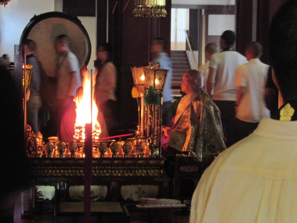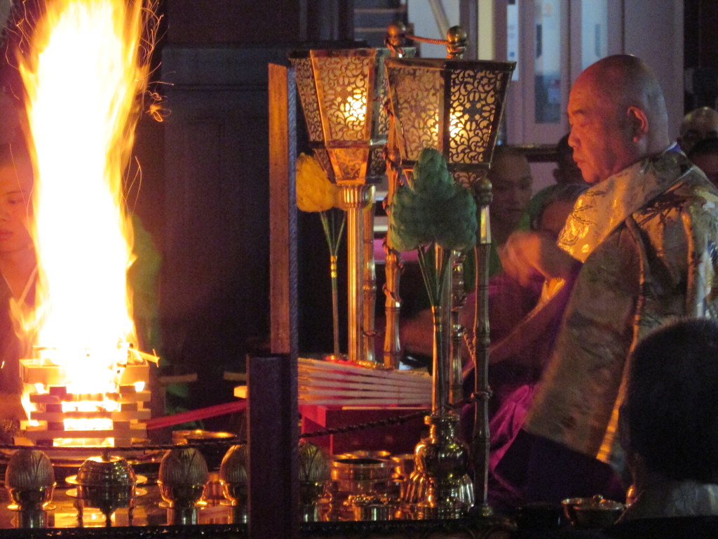 職員の案内のもと回廊を通り本堂に入りますと、すでにたくさんの参拝者が護摩祈祷の修行をまっていました。今回は、特別の計らいで学生全員を内陣に通して頂き、護摩の修行を間近で参拝させていただくことができました。大きな太鼓の鳴り響く音に合わせて、読経がなされ、護摩の火が勢いよく上がるのを見ると何ともいい表せない気持ちになり、高揚し感動いたしました。