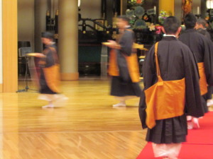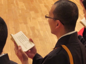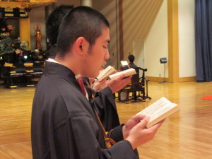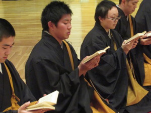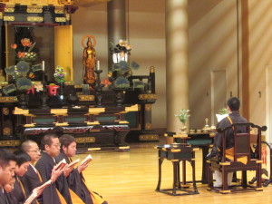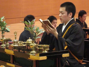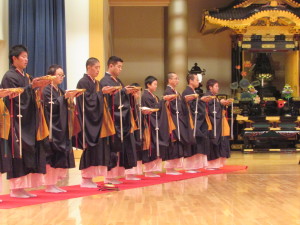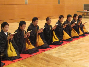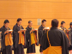 平成27年12月16日(水)、「水曜礼拝」といわれる昼休みの時間帯を利用して、大正大学礼拝堂において、智山コースに所属する一年生たちによる「二箇法要」を勤修いたしました。今年度、真言宗智山派が担当する最後の「水曜礼拝」でした。前回は三年生に出仕いただきましたので、今回は一年生全員での出仕となりました。一年生にとっては今年一年研鑽した集大成として「二箇法要」を実習することになり日ごろの成果を発揮する重要な日となりました。