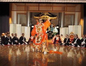 また、法要の中で雅楽とのコラボレーションを行いました。舞楽「陵王」は、古代中国の南北朝時代、北斉の国の蘭陵王長恭(らんりょうおうちょうけい)という実在した人物の故事を題材に作られた舞楽です。陵王は、武勇才知に優れ、周囲が見とれるほど美しい容貌をしていたために部下が見とれてしまい、士気がなかなか上がりませんでした。そのため戦いにはいかめしい仮面を着けて臨んだところ、大勝利を収めたと伝えられています。現在では、舞楽曲の中でも最も演奏される機会の多い曲です。