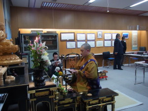 もう夏休みになってしまいましたが、平成二十八年六月一日に、天台勤行室において台友会(大正大学で天台宗の学生を中心とする集まり)主催による山家会法要が執り行われました。山家会とは、天台宗を開かれた伝教大師最澄様の命日(六月四日)にちなんだ法要です。伝教大師の威徳を讃え、その御恩に感謝するのが、この山家会です。