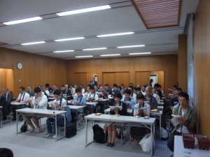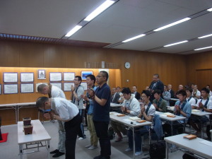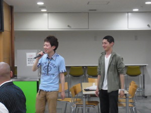 その後に今年入学した一年生13名、編入生7名、大学院生4名を迎える新入生歓迎会を行いました。中でも新入生の自己紹介は、入学したばかりの緊張感のなか、個性豊かな挨拶あり、笑いありの楽しい時間となりました。また、最後には先生・学生全員で肩を組み校歌を斉唱しました。