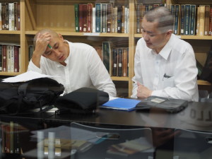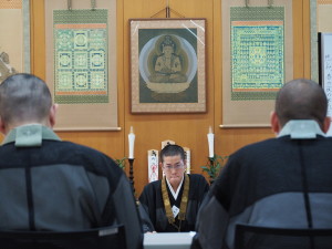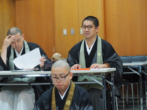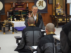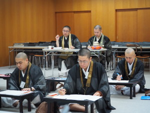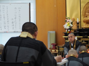 緊張しながらも、きちんと自分の法話を先生、院生そして仲間たちへ身振り手振りを交え実演を行います。