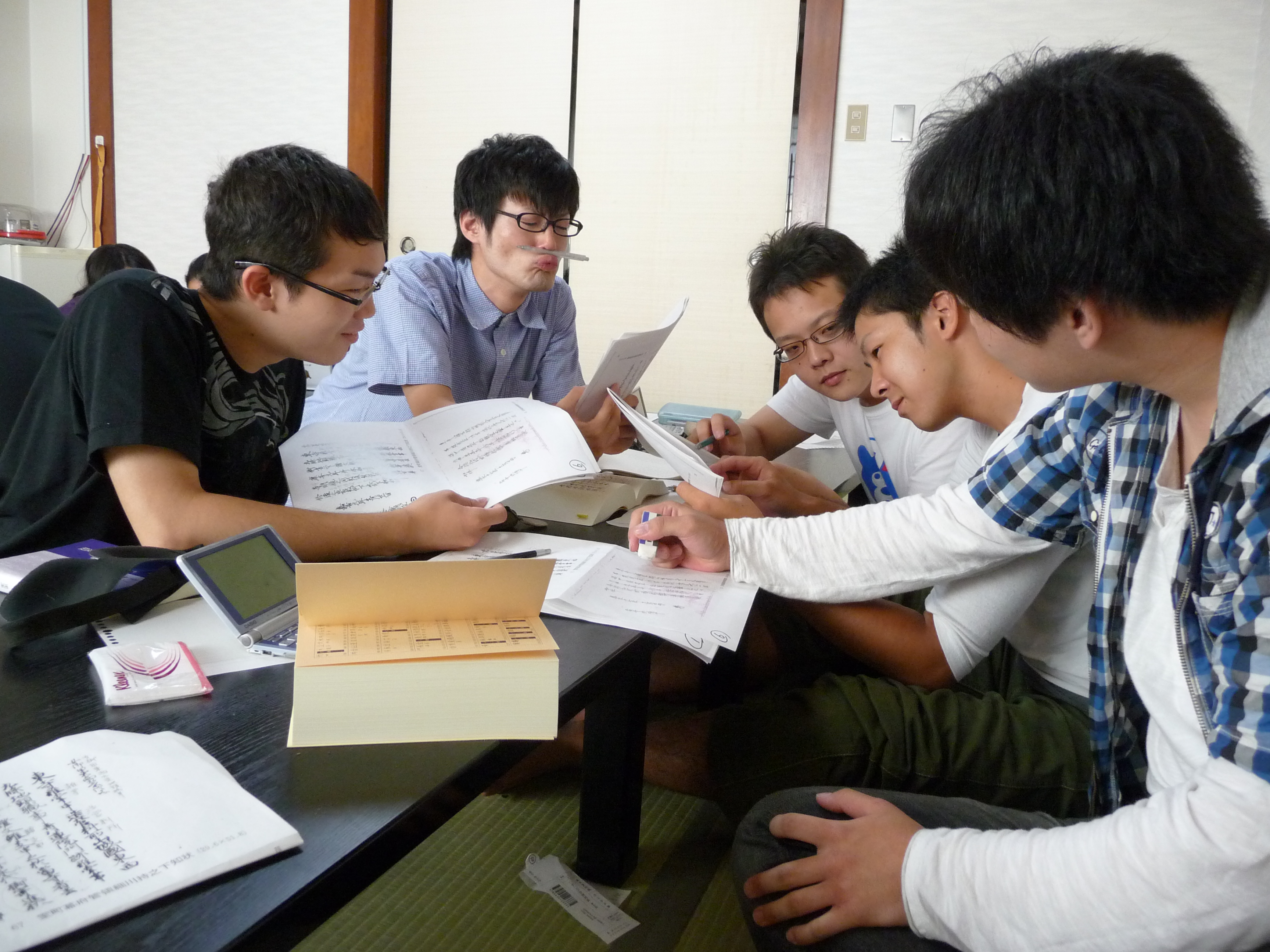 こちらは辞書を片手にみんなでテキストを寄せ合っている様子。