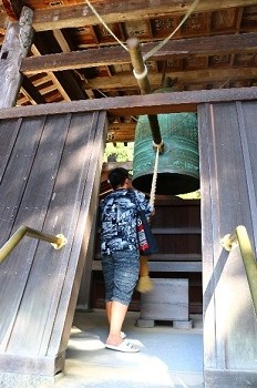 岡寺の説明はクスミンが丁寧に話してくれました。皆汗をふくのも忘れ聞きました。ゼミ長が旅行の安全を祈って鐘をつきました。