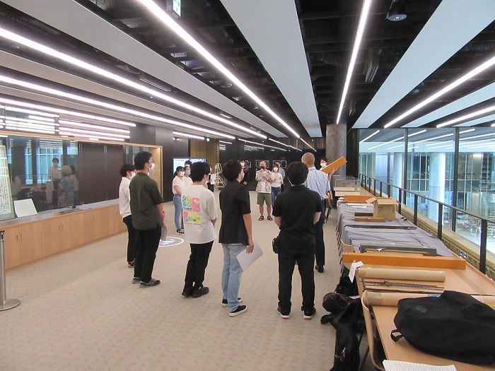 展示ケースから箱に戻す際も細心の注意を払います。なお、博物館等で実際に作業する際は、