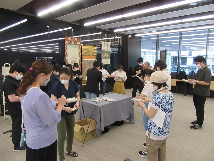 つづいて、参加者も実際に掛け軸を手に取って練習しました。掛け軸の紐を綺麗に結ぶためには