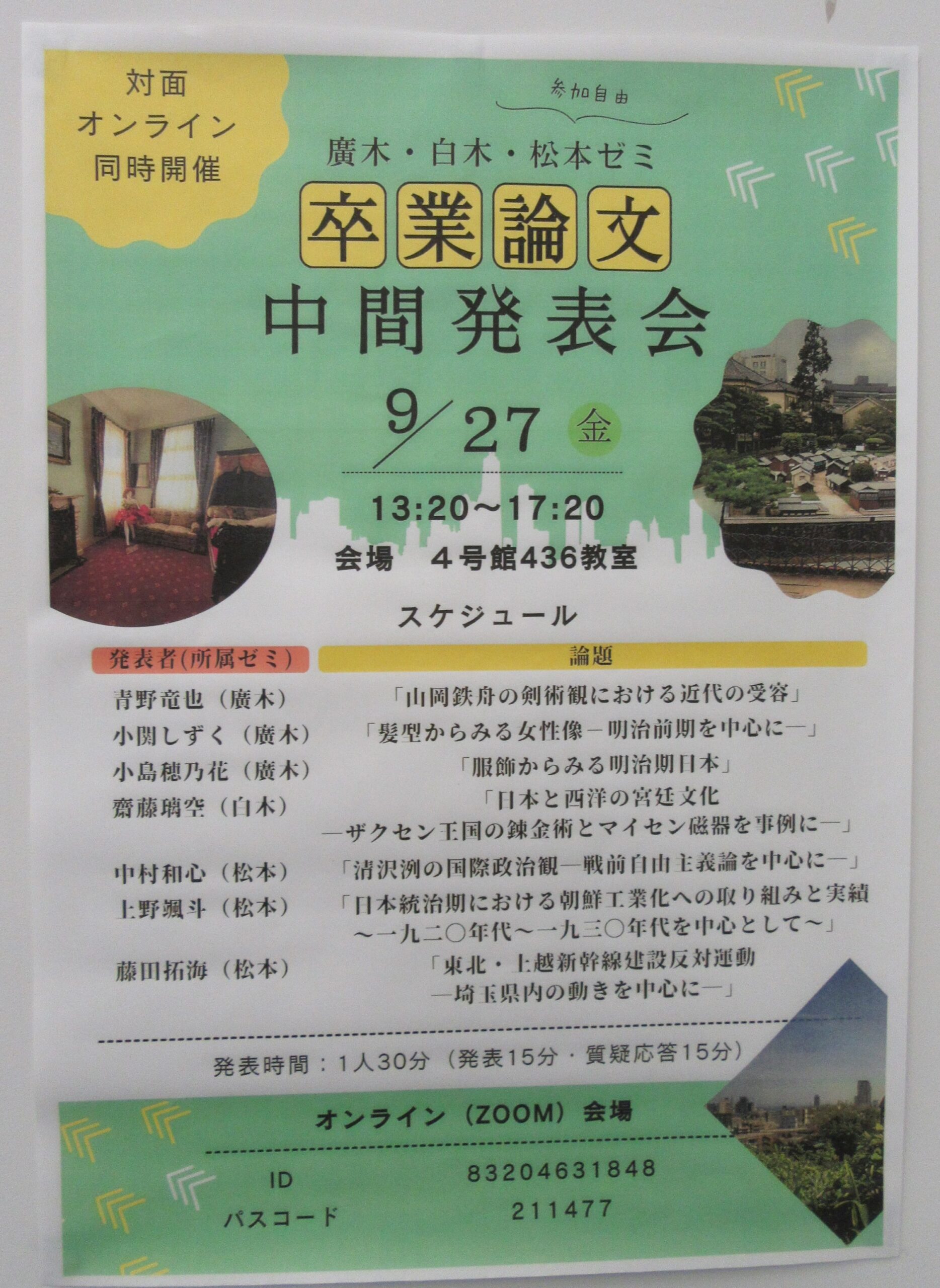2024年9月27日(金)に、卒業論文中間発表会が開かれました。近現代史を専攻する白木太一先生、廣木尚先生、松本洋幸先生の3ゼミの学生さんたちが集まりました。