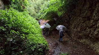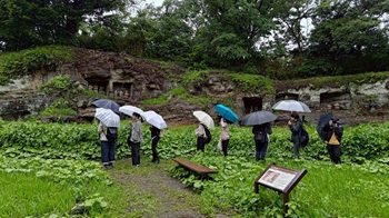 最初に訪れたのは、名越切通しの奥にある「まんだら堂やぐら群」です。春と秋の限られた期間のみ公開される場所で、今回はその公開期間にあわせて見学しました。雨の中、ぬかるんだ山道を進んだ先には、中世のやぐら(鎌倉時代の横穴式墳墓)が静かに並び、荘厳な雰囲気をたたえていました。普段は立ち入ることのできない史跡を訪ねる、貴重な機会となりました。