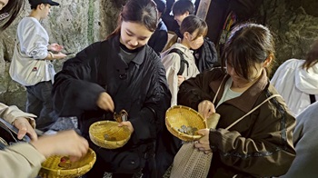洞窟を抜けた先にあるこの神社は、「銭洗い」で有名なパワースポット。みんなでお金を清めて、金運アップを願いました。源頼朝や北条時頼にまつわる伝承を持つ神社でもあり、観光と信仰が結びついた空間を体験することができました。