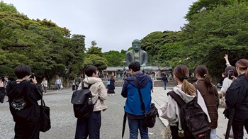 鎌倉観光の定番、鎌倉大仏。今回は外から眺めるだけでなく、大仏の中にも入ってみました。また同行していただいた伊藤先生から大仏殿の礎石について説明していただきました。