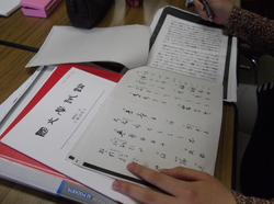 右の写真は、読んでいる最中を撮影したものです。自転車と同じで、最初は練習が必要ですが、慣れてしまったら、あとはスイスイ読めます!もし、わからない字があった場合は、写真手前の「変体仮名(筆で書かれたひらがな)の例」を参照すればすぐにわかります!