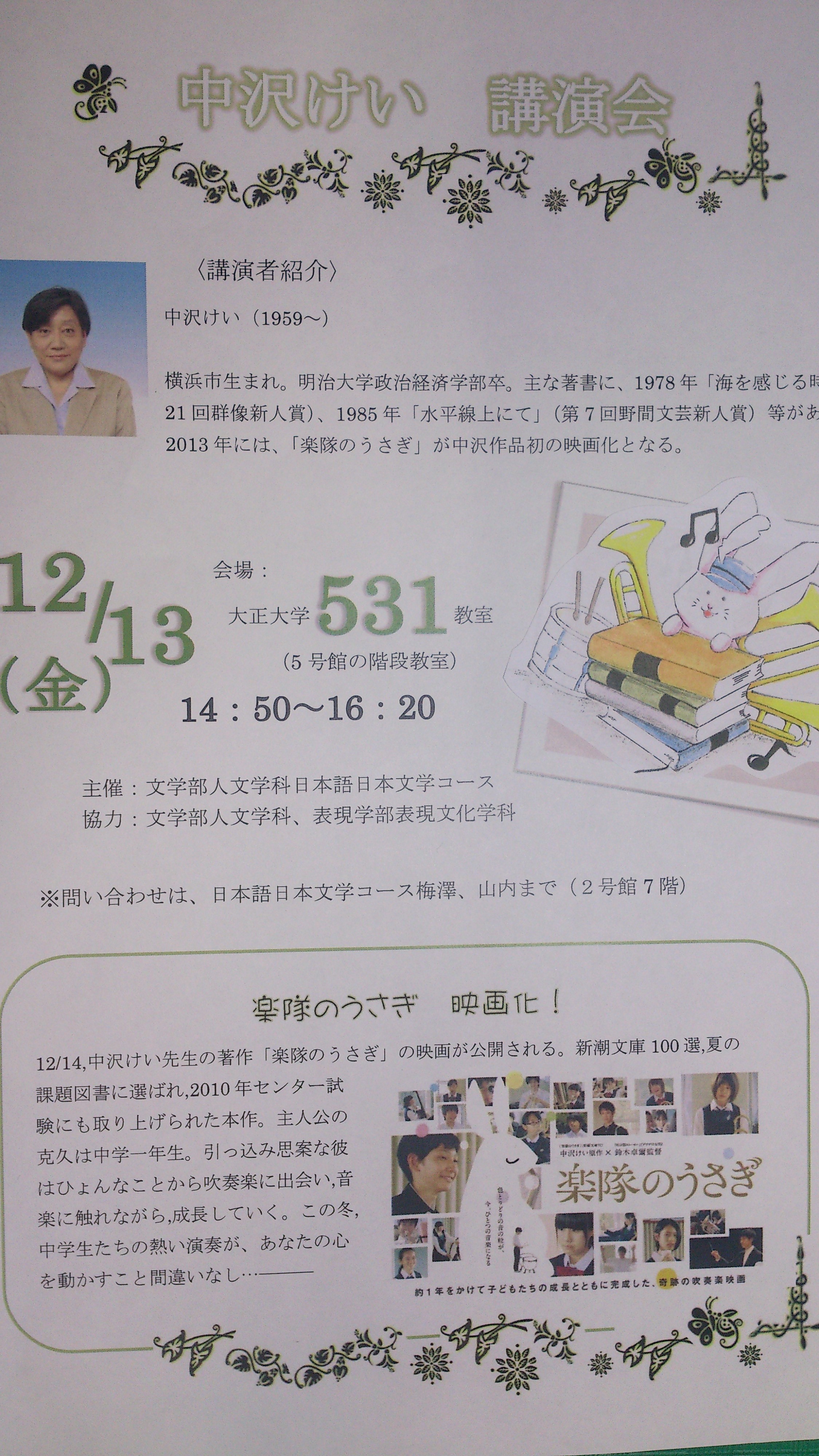 中沢けい先生講演会「 『楽隊のうさぎ』とわたし』です。