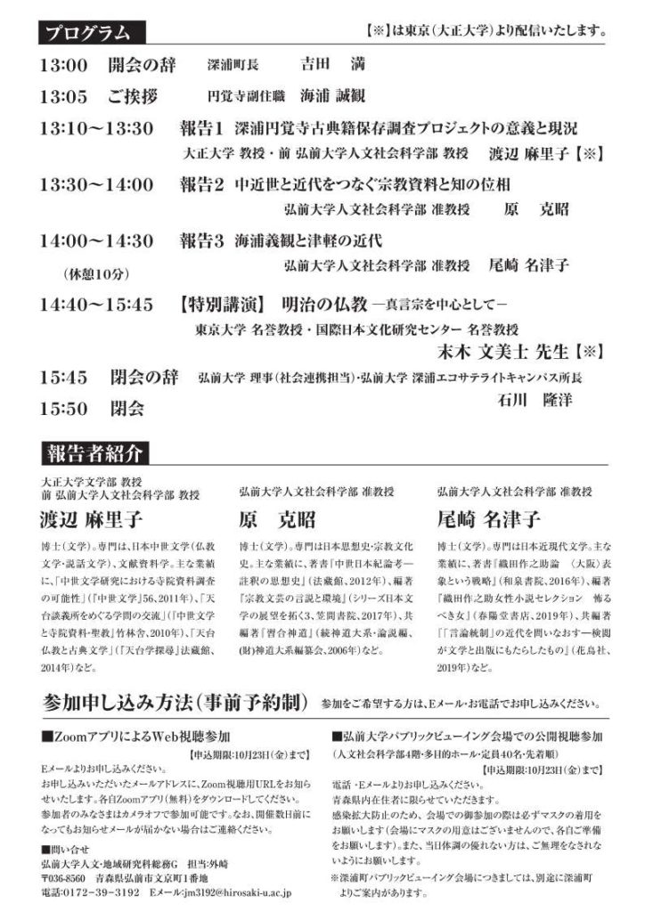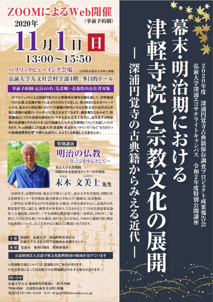 来たる11月1日(日)13:00~15:50に、「幕末・明治期における津軽寺院と宗教文化の展開―深浦円覚寺の古典籍からみえる近代―」と題したイベントを、ウェブ上において行います。大正大学からの配信としては、本学日本文学科の渡辺麻里子による報告「深浦円覚寺古典籍保存調査プロジェクトの意義と現況」と、東京大学名誉教授の末木文美士先生による講演「明治の仏教―真言宗を中心として―」が行われる予定です。