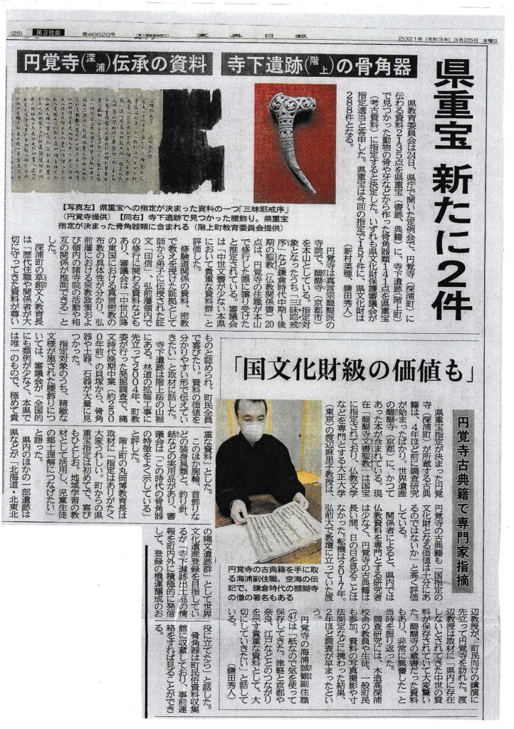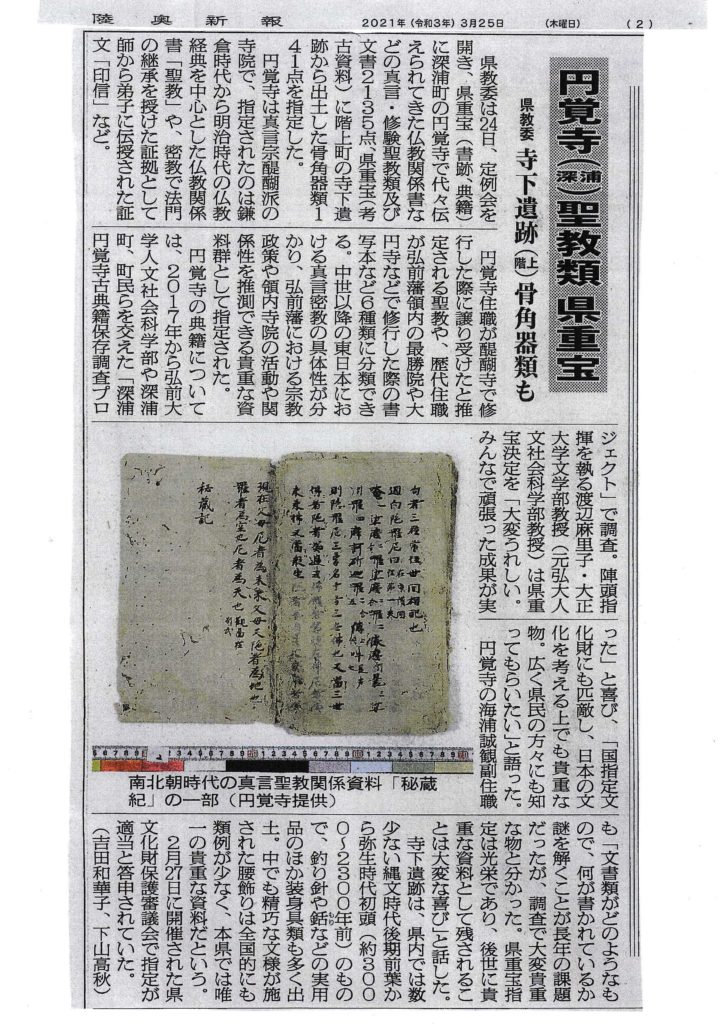 去る3月24日に、大正大学文学部日本文学科の渡辺麻里子先生が調査されていた、青森県深浦にある円覚寺の所蔵資料が、青森県の文化財に指定されました。この調査は大学生・大学院生、地元の高校生や市民が参加する、市民参加型調査(青森モデル)として行われたものです。下記に、渡辺先生のインタビューを含む2021年3月25日の「東奥日報」と「陸奥新報」を引用しますので、ぜひ御覧ください。