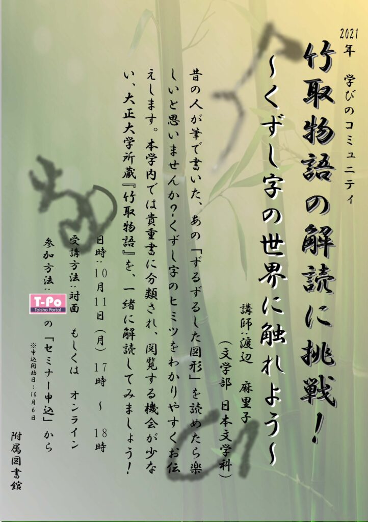 10月11日(月)17時より、大正大学附属図書館の「学びのコミュニティ」(全学学生対象)の一環として、日本文学科教員の渡辺麻里子が登壇する「竹取物語の解読に挑戦!~くずし字の世界に触れよう~」が開催されます。 |