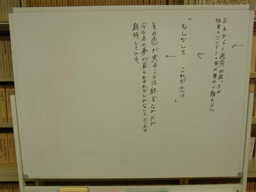 | 本日6月4日(土)は対面式の鴨台祭1日目でした。お天気にも恵まれて、日本文学科学生企画「文葉館」にもたくさんの方にご来場いただきました。ありがとうございました。明日も展示は続きますので、引き続きお待ちしています! 下には本日の「結末から始まるリレー小説」の結果や、イベントの様子を載せました。リレー小説はブログ上では小さくて読みづらいかもしれませんが、私的にお楽しみいただくぶんには、画像を保存していただければ拡大が可能です。 |
