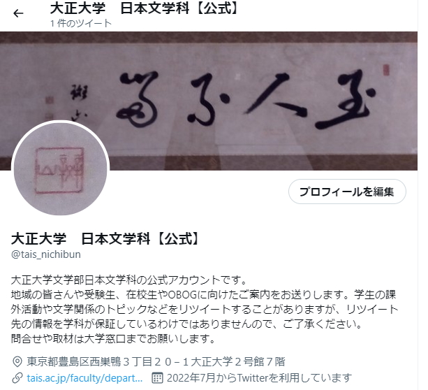 大正大学日本文学科では、この度Twitterに下記のアドレスで公式アカウントを開設しました。 大正大学 日本文学科【公式】 https://twitter.com/tais_nichibun こちらのアカウントから、地域の皆さん、在校生、受験生、OBOGに向けた情報発信を行っていく予定です。こちらのブログも併用しつつ、情報発信を強化していく予定なので、どうぞお楽しみに! 良かったら、フォロー、リツイートなどの反応もよろしくお願いします。 なお、在校生のガイダンスなどの学内向けに限られる情報については、従来通りT-Poを用いていきますので、そちらの確認も怠らないようにお願いします。 また、在校生や受験生の個人のアカウントをフォローバックすることには様々な弊害があるかと思いますので、学科から個人へのフォローバックは原則としていたしません。学生の課外活動や学生発案のイベント、サークル活動などのグループについては個別に検討することになるかと思います。何かご相談があれば学科事務室までメールでお問い合わせください。