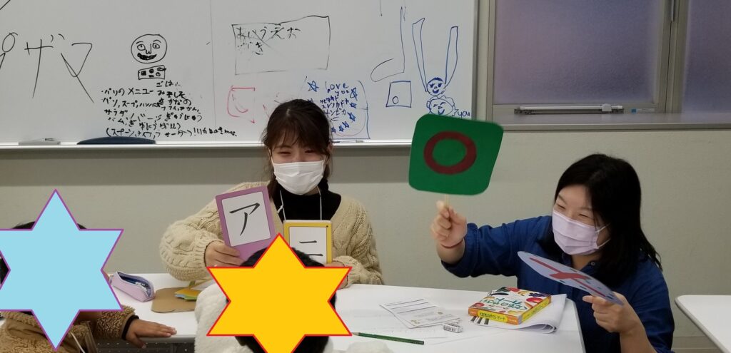 例えば、下の写真は正解・不正解を示す際に用いられる手作りのグッズです。ちょっとした工夫ですが、授業が楽しくなります。 |