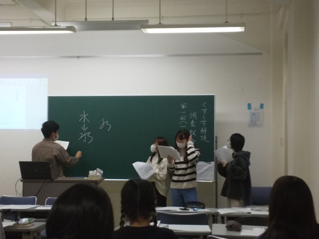 | 授業の構成は毎年更新されていますが、例えば、今年度の「近現代文学」分野では、高校の教科書にも掲載される中島敦『山月記』を取り上げて、互いの意見を聞きながら、段階的にレポートを進化/深化させていく取り組みを行っています。 高校で習ったことがない学生はもちろん、習ったことがある学生も、取り組む前には気付いていなかった「根拠」をあげた読解が可能であることを実感出来て、驚いているようです。 「日本文化」分野では、くずし字の解読などにも挑戦しています。古典の写本は筆で書かれており、我々が読み書きしている字形とは異なる字体で書かれていますが、その解読に挑戦することで、「読めた」という実体験を積むことが出来ています。 |