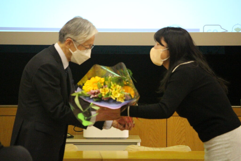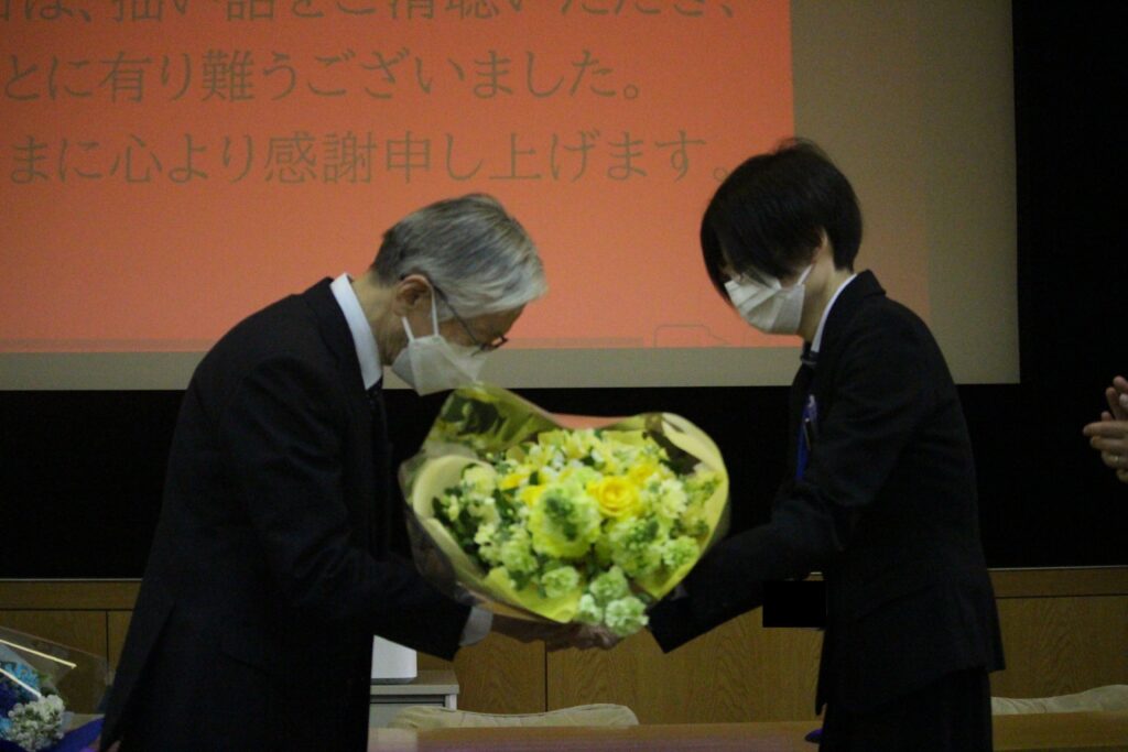ご講義の終了後には、花束の贈呈も行われました。 小嶋先生、素晴らしいご講義と、今年度までの大正大学へのご貢献を誠にありがとうございました。日本文学科教職員一同、引き続き小嶋先生に色々とお教えいただき、また、先生のお作りになってきた学風を継いでいけたらと考えています。小嶋先生におかれましても、ご健康にお気を付けになって、大正大学におけるますますのご活躍をお願いいたします。 |