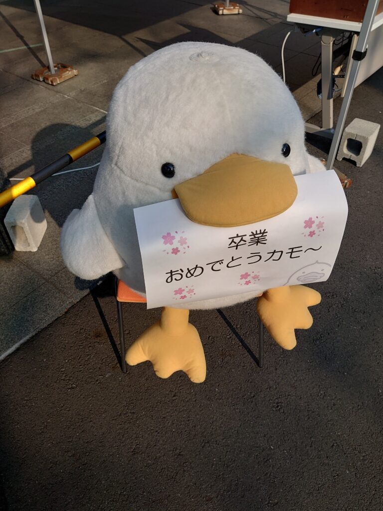 ![]() 【大学構内の様子】マスコットのT-Duckもお祝いしていました |