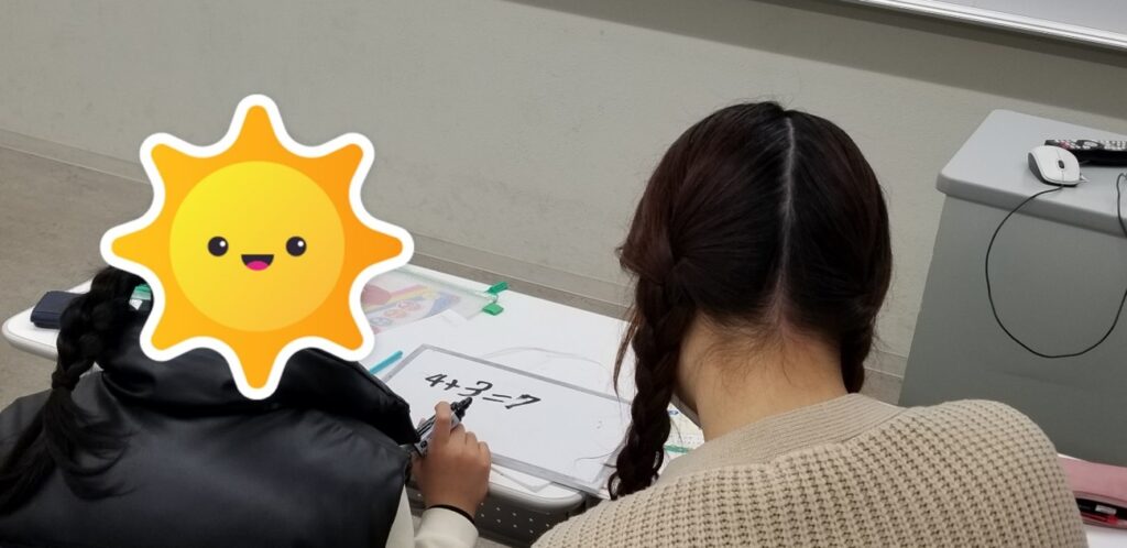 | 三枚めの写真は、小学校1年生の算数で、いわゆる文章題を解いています。かなり難しい計算問題が解ける子も、文章題となると苦戦しています。担当した学生サポーターも、「算数を理解するにあたっても日本語力が必要になる」と言っていました。今日は、小学生組も、熱心に各自の学習に取り組んでいました。 |