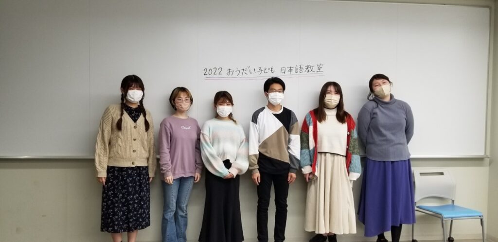 | 四枚めの右の写真は、前回と同じひらがなカルタの様子です。 今日は、読み手も学習者である小学生がやってくれました。読む方も聞く方も、真剣そのものです。集中力がなくなりやすい学習の後半戦で、かるたは大活躍しています。 最後に、下の写真はおまけで学生サポーターの記念撮影です。 この3月で晴れて卒業していく学生サポーターもいます。仕事は一般企業に決まっていますが、「将来的にはボランティアで日本語教育にもかかわっていきたい」と、話していました。少し寂しさもありますが、卒業後の活躍を期待したいと思います。 |