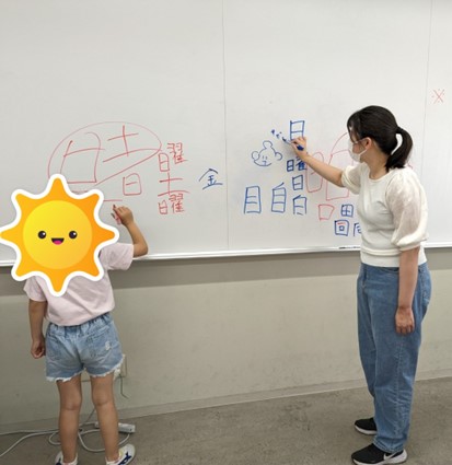 | 三枚めの写真は、小学生が漢字の学習をしています。ホワイトボードには、「土」「日」という文字が書かれています。なお、この後、「だいすき」という文字が付け加えられ、「土日だいすき」という文が完成しました。この素直で正直なことばに、見た人は、みんな笑顔になっていました。 |