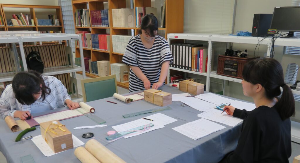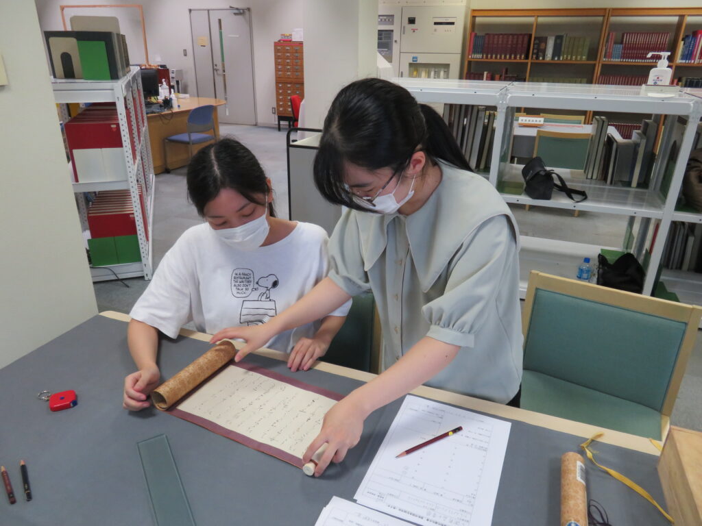 | ・資料調査は複数回経験しましたが、巻子本の計測や巻く作業は初めてだったので、貴重な経験になりました。本の内容についても書簡や絵巻など、これまで見たことのないものばかりで楽しかったです。(大学院生博士前期課程1年) ・得るものの多い時間でした。巻子本を触ったのも、巻いてみたのも初めてで、助けてもらいながら計測しました。また参加できる機会があれば参加したいと思います。(日本文学科3年生) ・あまり見たことのなかった綴じ方の本もあって面白かったです。くずし字の勉強をしなければ、という気持ちになりました。書簡が一番新鮮でした。(日本文学科3年生) ・以前、日本文学実践演習で勉強したことを思い出しながら、今回参加をすることができました。また和古書も様々な種類のものがあったので、それにも驚きながら、各書物に合わせた調査の方法も学ぶことができました。量が多くて大変でしたが、やりがいもあり、楽しく行えました。(日本文学科2年生) ・和本の調書の書き方や計測のやり方を実践を通して学ぶことができ、大変貴重な経験をさせていただいたと感じています。作業自体は地味で単調かもしれませんが、和古書を扱ううえで必要不可欠なことであるとわかりました。授業では見られなかったような本を調査できたことで、和本への興味がさらに深まりました。(日本文学科2年生) それぞれの学生の興味や関心がさらに広がる機会になったようで、何よりと思います。日本文学科としては、こうした実践的な体験を経て、学芸員を含む研究職などの学生の夢に繋げていけるように、これからも支援していきたいと考えています。 |