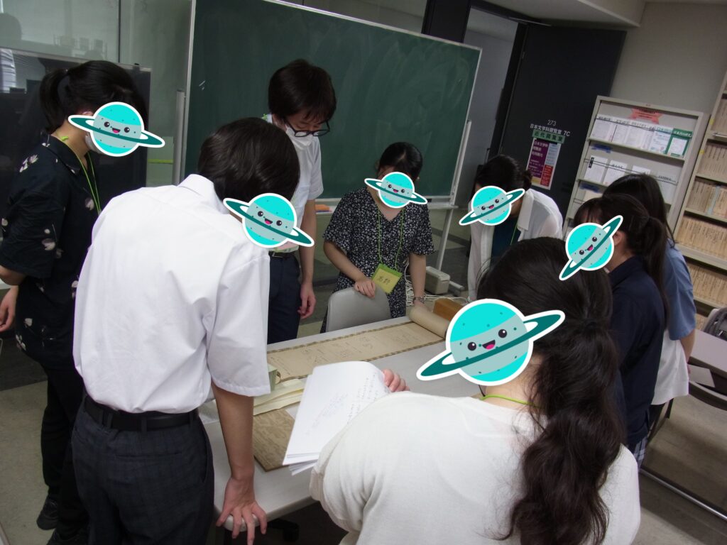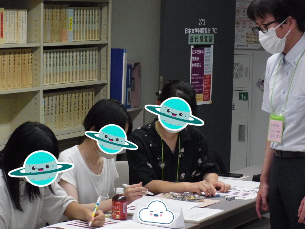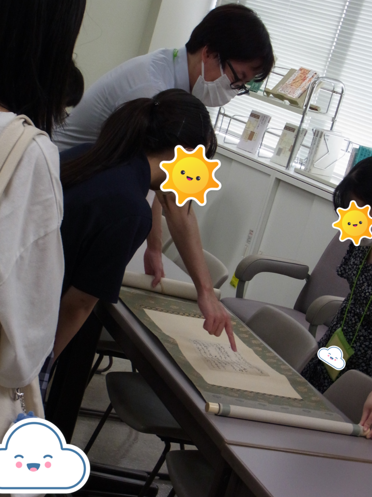 対象とする古筆切は一面10行ぶん。それなりの分量がありますが、今回が6回目の皆勤賞の受講生もいて、最後まで時間内に読み通すことができた方もいました! 最後に、「くずし字は読み続けて慣れることが大切」という古田先生のお話と参考文献の紹介があって、全6回のくずし字講座、無事に終了です。![]() 【受講終了後①】田中先生や古田先生がお持ちの資料を希望者で見学しました ![]() 【受講終了後②】掛け軸の古筆切を解説する古田先生 受講生の皆さんからは、以下のような感想をいただきました。 ・計5回参加させてもらいましたが、とても勉強になりました! まだまだ表を見たり先輩方に聞いたりしないとわからない文字も多かったですが、初回よりはだいぶ読めるようになったと思います。わかると楽しくてやりがいもありました。 ・「これは「も」かもしれない」「これは「に」っぽいな」など、ある程度予想しながら読めるようになりました。ですが、まだまだ間違えてしまうことも多いので、これからもたくさん読んで慣れていきたいです。 ・「の」や「か」などの字は変体仮名一覧を見なくても読めるようになりましたが、「た」や「ほ」などはまだ難しいと感じているので、もっと読めるようになりたいと思いました」といった感想がありました。 それぞれに「できる」実感と、その先の課題も具体的に見えてきたようで、良い学習をしてもらえたようで何よりでした。ぜひ、引き続いてくずし字マスターを目指してがんばってください! また、「特に『源氏物語』の回に興味があったので、今回お話をたくさんうかがうことができてとても嬉しかったです。」といった感想もいただきました。一口に大学の教員といっても、それぞれ専門としている作品があり、古田先生の場合は『源氏物語』が研究の中心とのこと。その話を楽しんでもらえたならとても良かったです。 受講生の皆さんにおかれましては、暑い中でのご参加ありがとうございました。初めての試みでしたが、ご興味を持っていただいた中高の先生も含めて、多くの受講生にご参加いただきました。日本文学科教職員一同、御礼申し上げます。 今後、9月上旬を目処に認定証を発行し、メール添付の形でお届け予定です。もし、9月11日(月)を過ぎても届かない場合は、送受信事故が考えられますので、お問い合わせください。何か変更などがありましたら、日本文学科ブログ・日本文学科公式SNSでもお知らせします。 ◎本講座は、2023年度学長裁量経費採択事業です。 ◎大正大学附属図書館の協力事業です。 大正大学文学部日本文学科では今後も様々な形で学科の魅力をお伝えしていく予定です。公式SNSアカウントもありますので、ぜひフォロー・拡散のほど、よろしくお願いします。 |