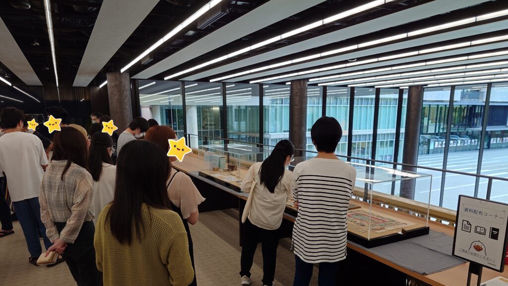 ![]() 「源氏物語展」見学の様子 受講生の皆さんも、博物館や美術館にあるような資料が、自分の通っている大学の図書館に所蔵されていて、間近で見ることができることに驚いていたようです。今回はケースの中でしたが、授業によってはもっと間近に調査を行うことができるものもあるので、楽しみにしてほしいところです。 |