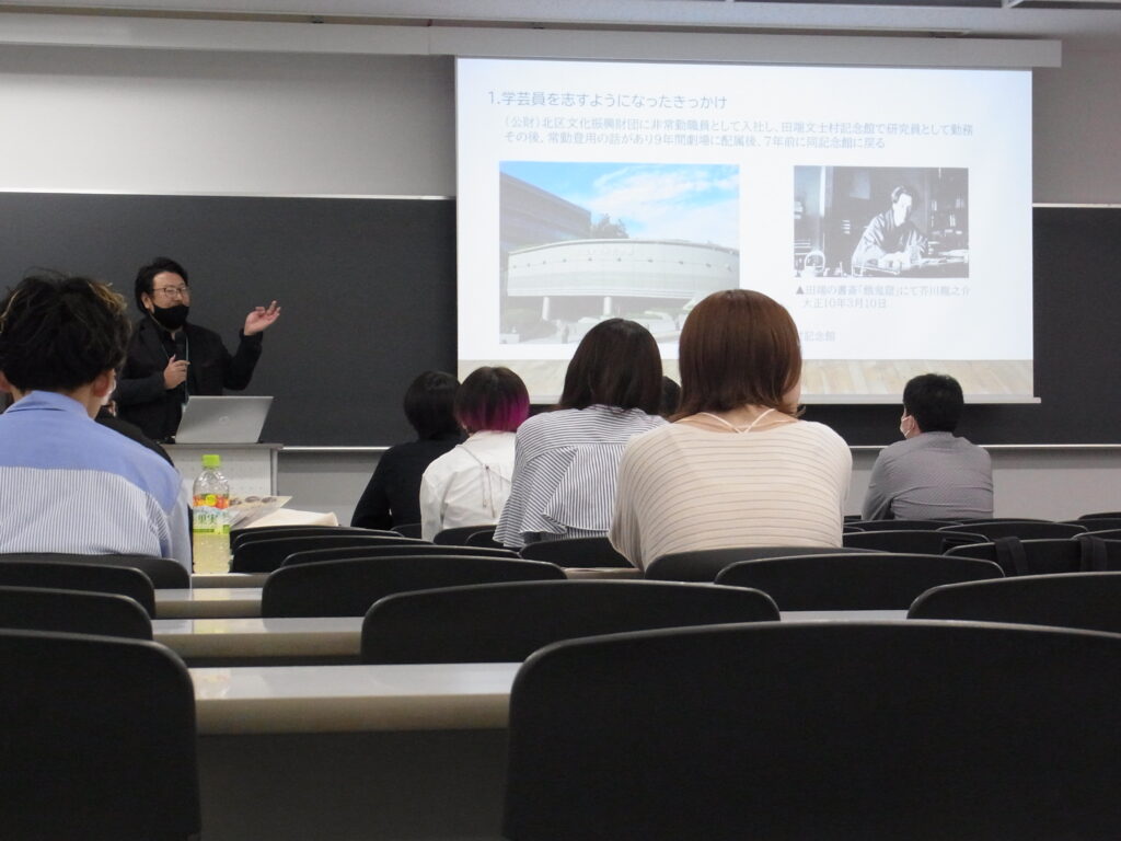 | 実際に受講中の1年生のSさんから、石川先生のご講義について感想を寄せていただいたのでご紹介します。 私が石川先生から伺った話の中で特に勉強になったのは、文学や芸術を広めていくために、既存のアダプテーション作品とコラボされているということです。伺ったお話によると、博物館法の一部が改正され、美術館や文学館、記念館などでは、多様な主体との文化観光による連携が奨励されているそうです。例えば石川先生が働いていらっしゃる田端文士村記念館では、文豪を題材としたゲーム作品の『文豪とアルケミスト』とコラボした展覧会やグッズ販売を行ったことがあるそうです。 また、石川先生には興味のある仕事の現場に身を置くことの大切さを教えていただきました。石川先生はたくさんの美術館などにボランティアをしに行ったり、勉強をしに行ったりして、ひたすら経験を積んだ延長線上に学芸員というお仕事に就かれたそうです。やはり現場に身を置いてから初めて分かったこと、得ることができたこともたくさんあるのだなと思いました。これから少しずつ、美術館や文学館を回って行こうと思いました。 Sさんが貴重な学びを得たようで何よりです。(Sさんに限りませんが)美術館や文学館を学生の皆さんが巡っていくきっかけになれば素晴らしいことと思います。石川先生、本当にありがとうございました。 |