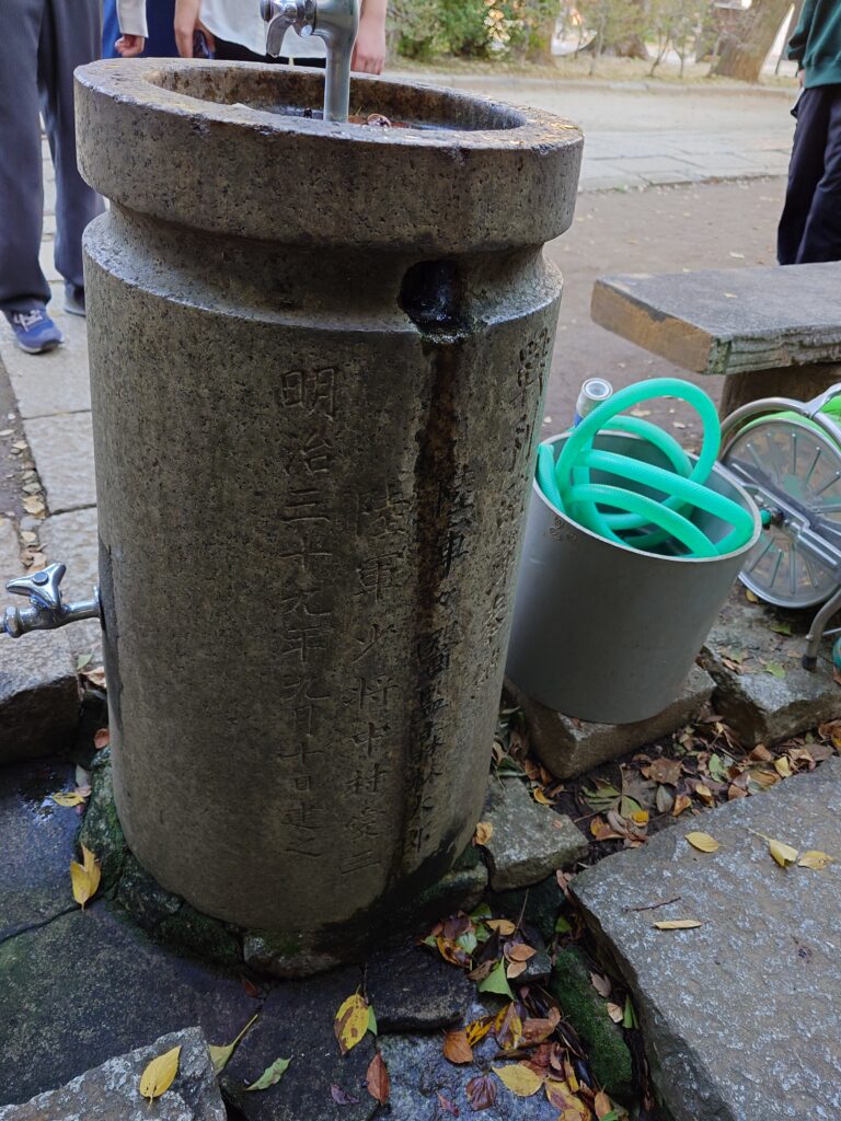 根津神社では、漱石や鴎外が腰掛けたともいわれる「文豪の石」や、陸軍軍医監の「森林太郎」の名が刻まれた明治三九年の砲弾の土台を見学しました。 同行いただいた、森鴎外の研究をされている岩谷泰之先生(日本学術振興会特別研究員PD)によると、第二次世界大戦まではこの土台の上に砲弾が載せられていたそうですが、砲弾は戦時中の金属の徴収により失われ、土台は水飲み場に改装されたそうです。その他、鴎外の小説『青年』では鴎外が考案した地図「東京方眼図」を主人公に持たせ、根津神社を歩く様子が描かれているという説明もありました。岩谷先生、ありがとうございました! |