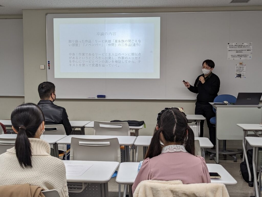 今回は大正大学日本文学科の課外活動の1つをご紹介します。 1月18日(木)、日本文学科の近代文学を専攻する4年生有志によるイベント「推しも好きだけど、近代文学も好き――推し活する私たちが語る近代文学の魅力――」を開催しました。12月中旬に卒論提出を終えた4年生たちが、発表準備はもちろん、計画からチラシの作成まで、熱心に準備をしてくれました。 |