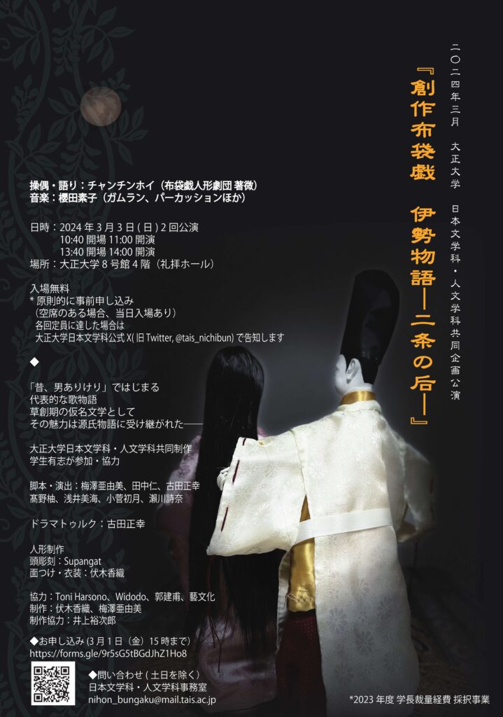 | 日本文学科・人文学科の学生、教員有志による企画のお知らせです。 今年度は学生の発案により、「昔、男ありけり」ではじまる代表的な歌物語である『伊勢物語』を人形劇化しました。布袋戯(ポテヒ)人形の遣い手であるチャンチンホイさん、音楽家でありガムラン奏者の櫻田素子さんをお招きしての異文化アダプテーションの新作です。 日時:3月3日(日) 第1回公演:11時〜、第2回公演:14時〜 場所:8号館4階(礼拝ホール) 参加費:無料 主催:日本文学科 各公演30名程度の予定です。各回が定員に達した場合は、日本文学科公式SNSアカウントで告知します。申し込みの詳細は、以下をご覧ください。 |