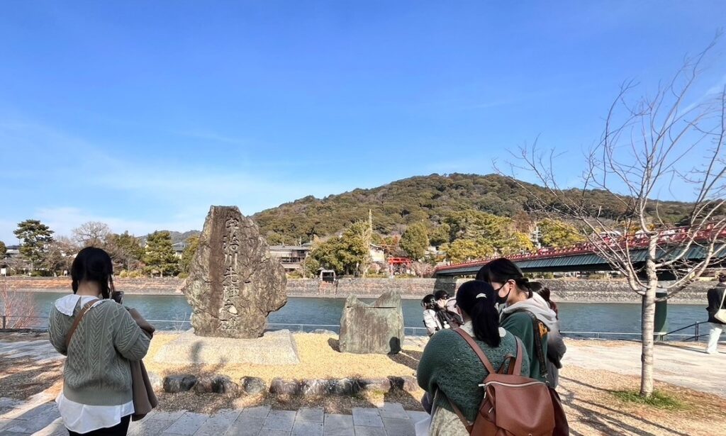 ![]() 現代の宇治橋(4年生Oさん撮影)。1週間前予報では雨でしたが、2日目もとても良い天気でした。 ![]() 宇治橋前の紫式部像の前で記念撮影を行いました。 ![]() 橋寺放生院(4年生Oさん撮影)。地蔵菩薩立像と宇治橋断碑について解説いただきました。 この後、宇治市源氏物語ミュージアムの見学を行いました。牛車や立体的な展示物が美しく見応え十分でした(掲載に支障があるので写真はありません)。図書室で一通り『源氏物語』の本をチェックする学生もいました。 続いて、午後は宇治十帖の像前に集合です。 |