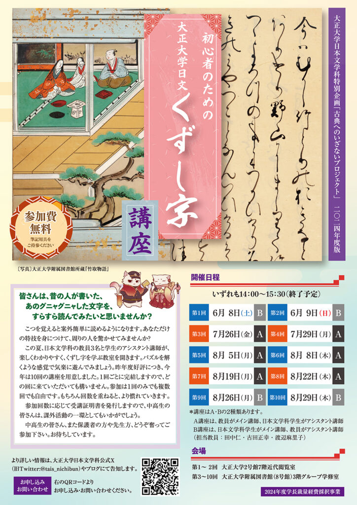 | ※1:A日程は教員がメイン講師、日本文学科在学生がアシスタント講師、B日程は日本文学科在学生がメイン講師、教員がアシスタント講師を勤めます。教員は、田中仁、古田正幸、渡辺麻里子が持ち回りで担当します。 ※2:6月8日・9日は鴨台祭(大学祭)企画として連動する予定です。あわせてお楽しみください。 【お申し込み・お問い合わせ】 チラシのQRコード、もしくは、https://forms.gle/8GahfAAjQgpAsVX87からお申し込みください(移動先はGoogleフォームで、どちらから移動してもかわりません)。 予定の変更などがあった場合は、本ブログや、日本文学科公式SNSアカウントから発信します。 大正大学文学部日本文学科では、これからも様々なイベントや取り組みを行っていく予定です。日本文学科公式SNSアカウントにおいて、情報発信をしていますので、良かったらフォローや拡散のほど、よろしくお願いします。 ◎本企画は、2024年度学長裁量経費採択事業として実施します。 |