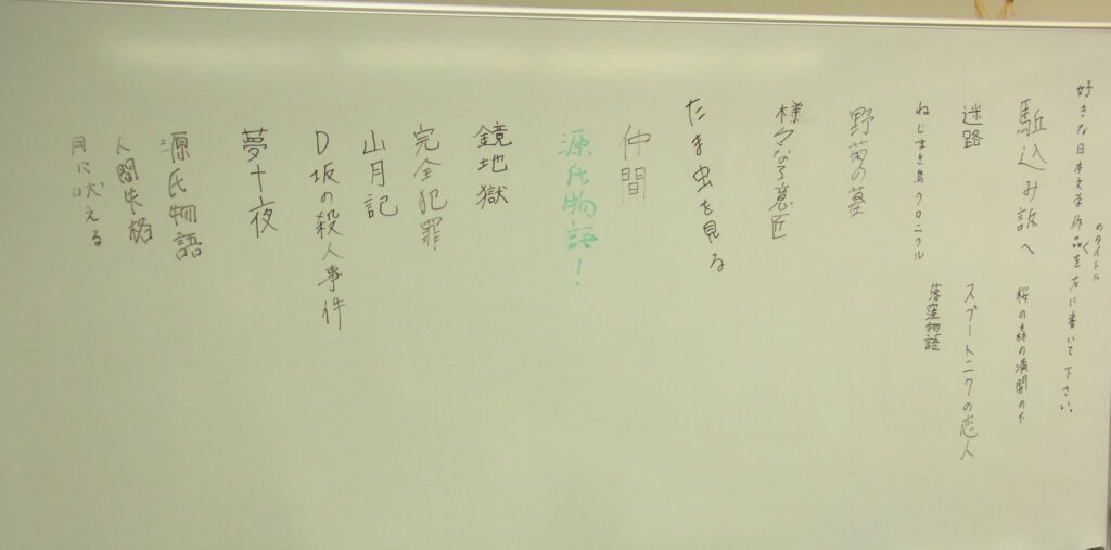 ![]() 【来場者の皆さんに好きな文学作品を書いてもらいました】 ![]() 【くずし字講座の様子】 ![]() 【くずし字講座チラシ】 |