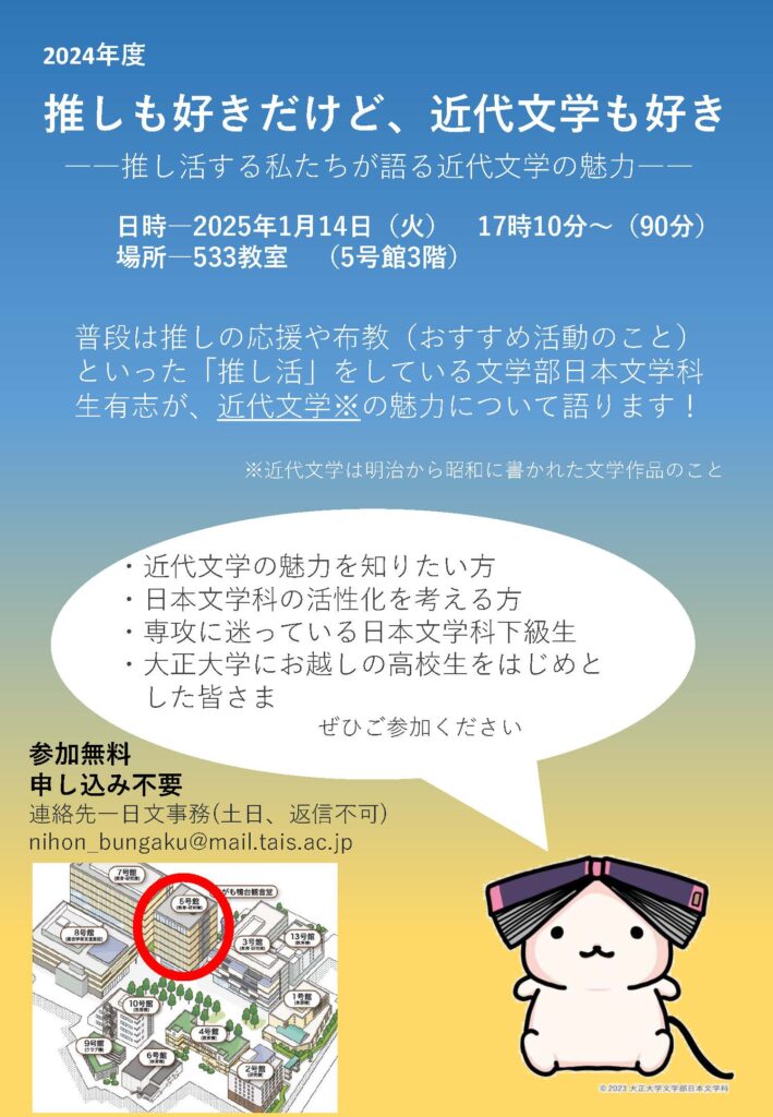 2025年1月14日(火)17時10分より、日本文学科生有志による学生主催イベント2024年度「推しも好きだけど、近代文学も好き――推し活する私たちが語る近代文学の魅力――」を実施します。 |